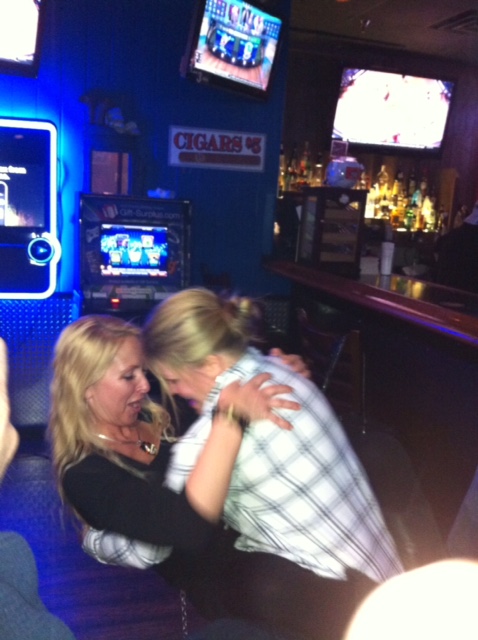 On the night of March 23, a FOCM networking event was held at Rally Point Sports Bar in Cary, NC. It turned out to be the last NC FOCM event for Heather Wallace before she moved to Arizona. Heather greets Kelly O’Brien by jumping in to her arms, which Kelly handles with agility.