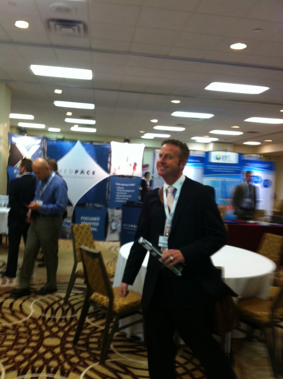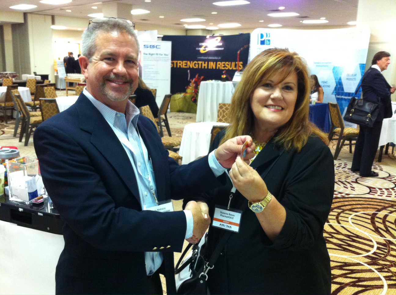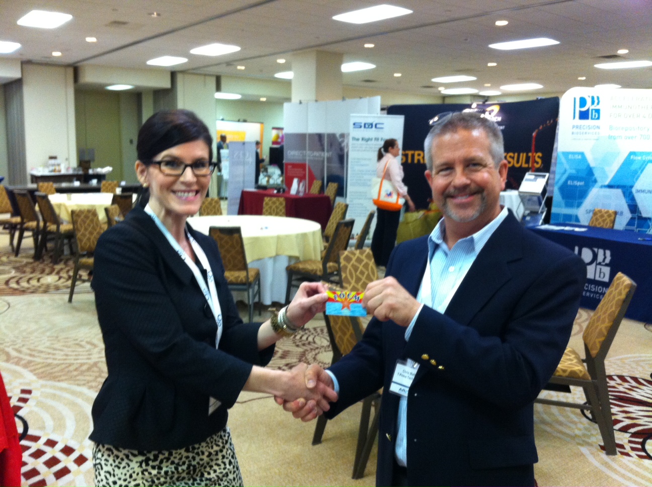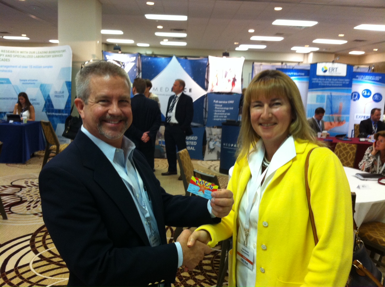At the Outsourcing in Clinical Trials -East Coast meeting in May, several existing FOCM members were spotted and quite a few new members received their cards.  Daneil Dixon was seen setting up her booth but no photos were allowed, Kris Kuhner was walking through the exhibit hall with purpose and Pete Nieto was in the bar.  Suzanne Besse and Lisa Banket with Pharmavoice, Pippa Wilson and Christina Alexander Smith with Barrington James and Bryan Clayton with Y-Prime all received their cards in a very busy meeting for FOCM.